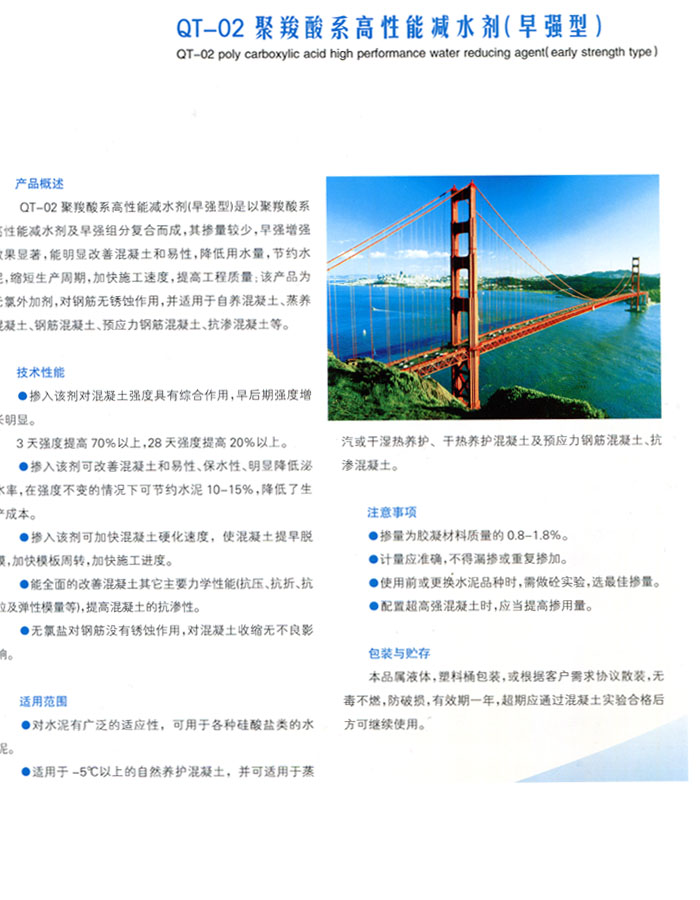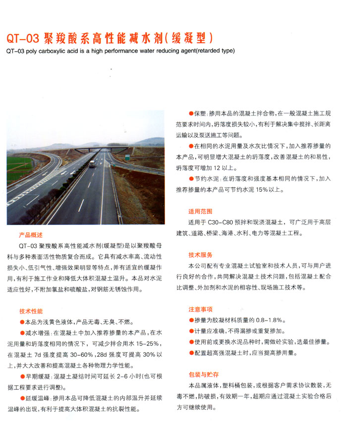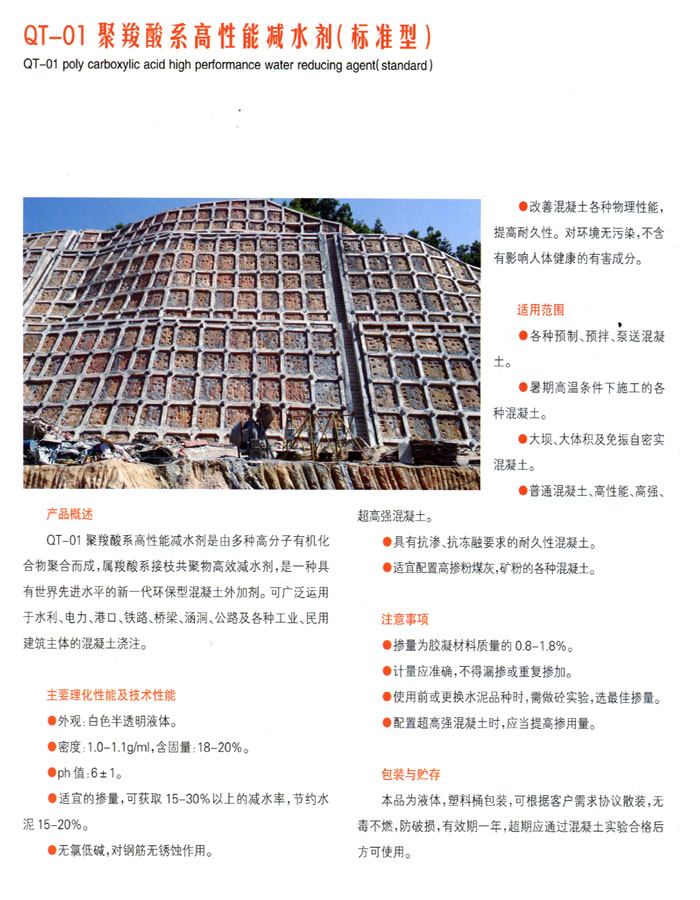 聚羧酸系高性能減水劑(緩凝型)是以聚羧酸母科與多種表面活性物質(zhì)復(fù)合而成。抗裂減水劑19:10 2016-4-19具有減水率高、流動性損失小、低引氣性、增強(qiáng)效果明顯等特點(diǎn),并有適宜的緩凝作用,有利于施工作業(yè)和降低大體積混凝土溫升。本晶對水泥適應(yīng)性好,不附加氯鹽和硫酸鹽,對鋼筋無銹蝕作。
